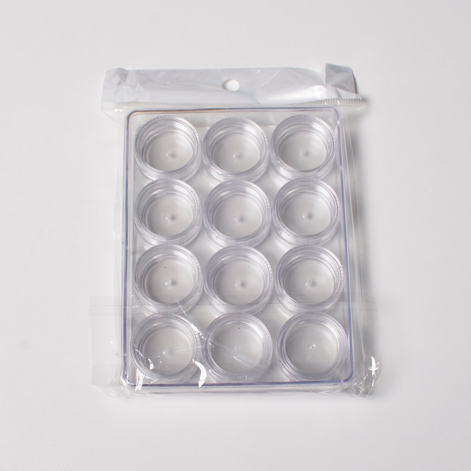 Set Includes: 12 clear, round jars with screw-on lids, housed in a single transparent plastic case.